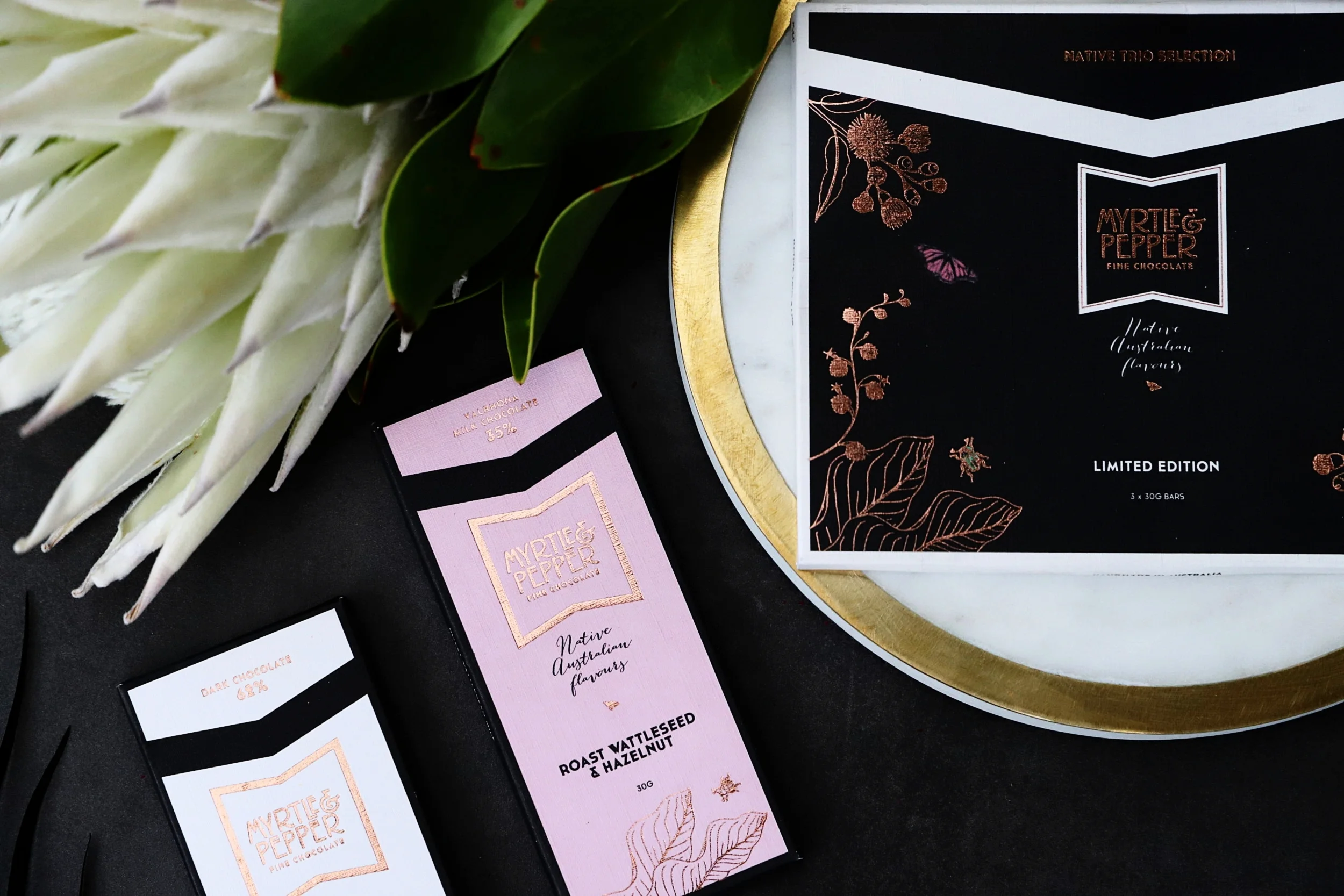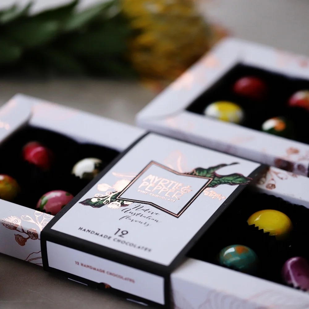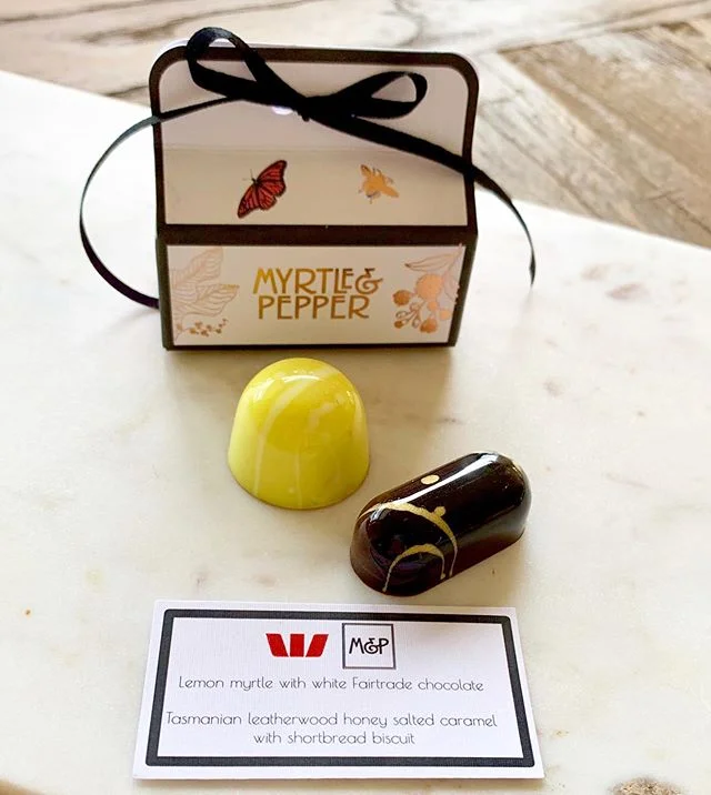 the m&P native australian chocolate bonbons are something special. voted the best of the best at the callebaut sydney royal chocolate show consecutively for 2017, 2018 & 2019. Each chocolate bonbon is painted by hand and contains flavours such as davidson plum & vanilla cheesecake, lemon aspen pie and tasmanian leatherwood honey caramel